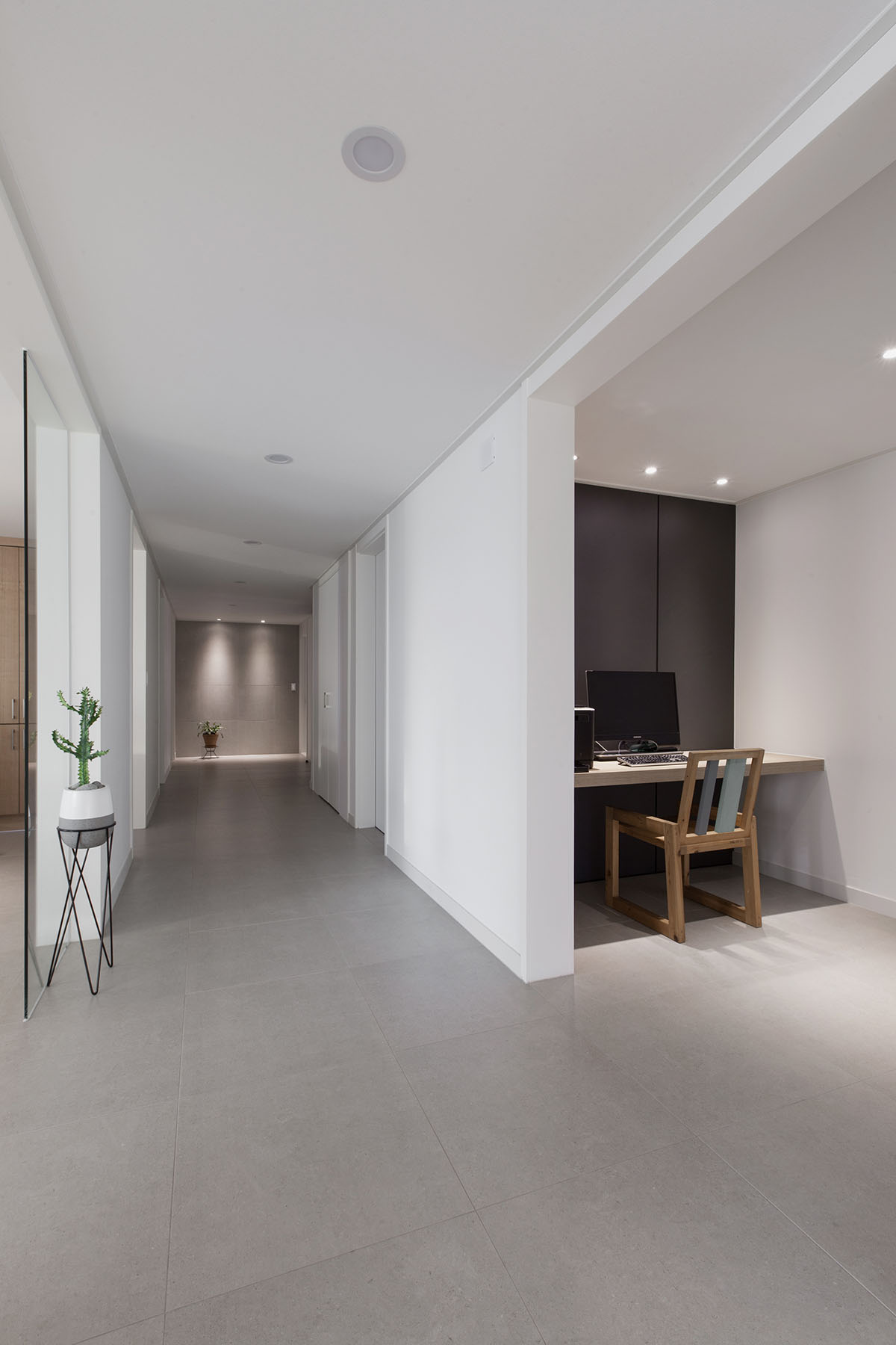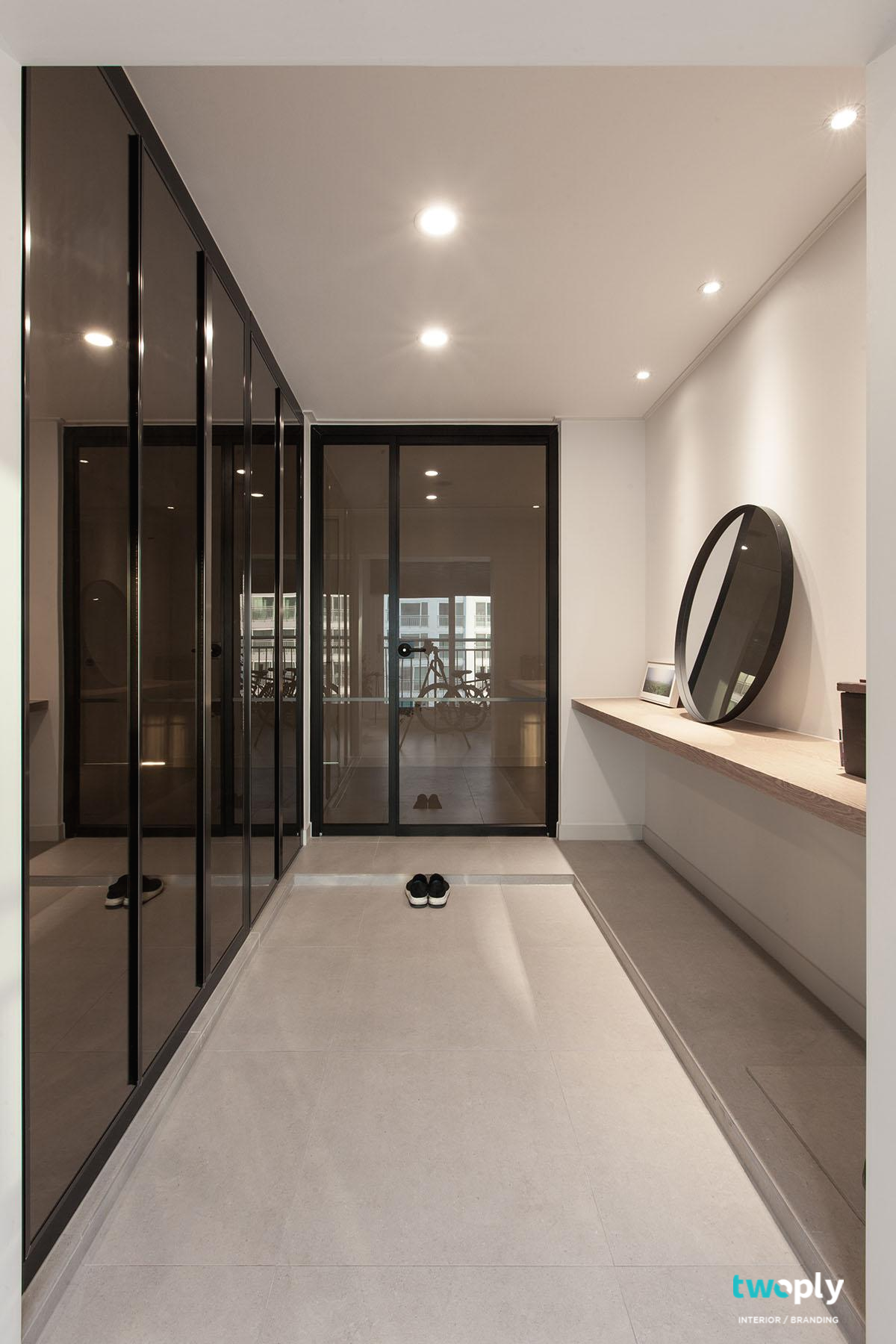 복도에서 보이게되는 기둥은 둥글게 곡선으로 표현하여 딱딱하고 차가운 느낌보다는 부드럽고 편안한 느낌을 주게 합니다. 또한 안방으로 들어가는 공간의 작은 짜투리 공간을 심플한 서재로 만들어 드렸습니다.