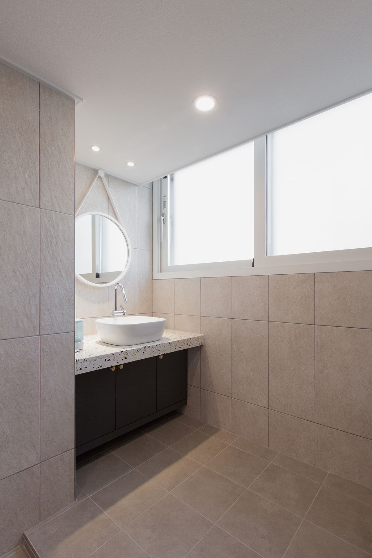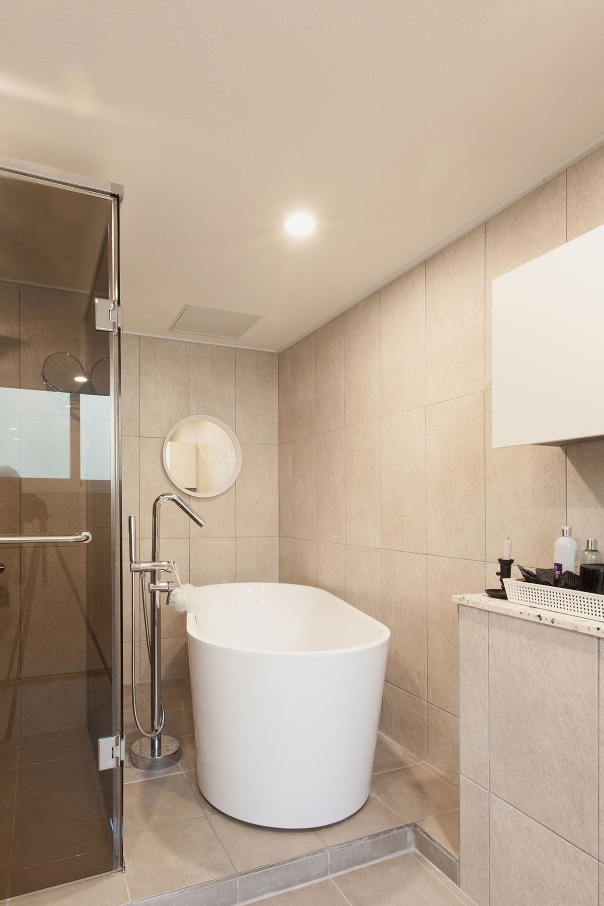 안방의 화장실은 따뜻한 느낌의 아이보리 느낌의 타일과 테라조를 사용하였습니다.